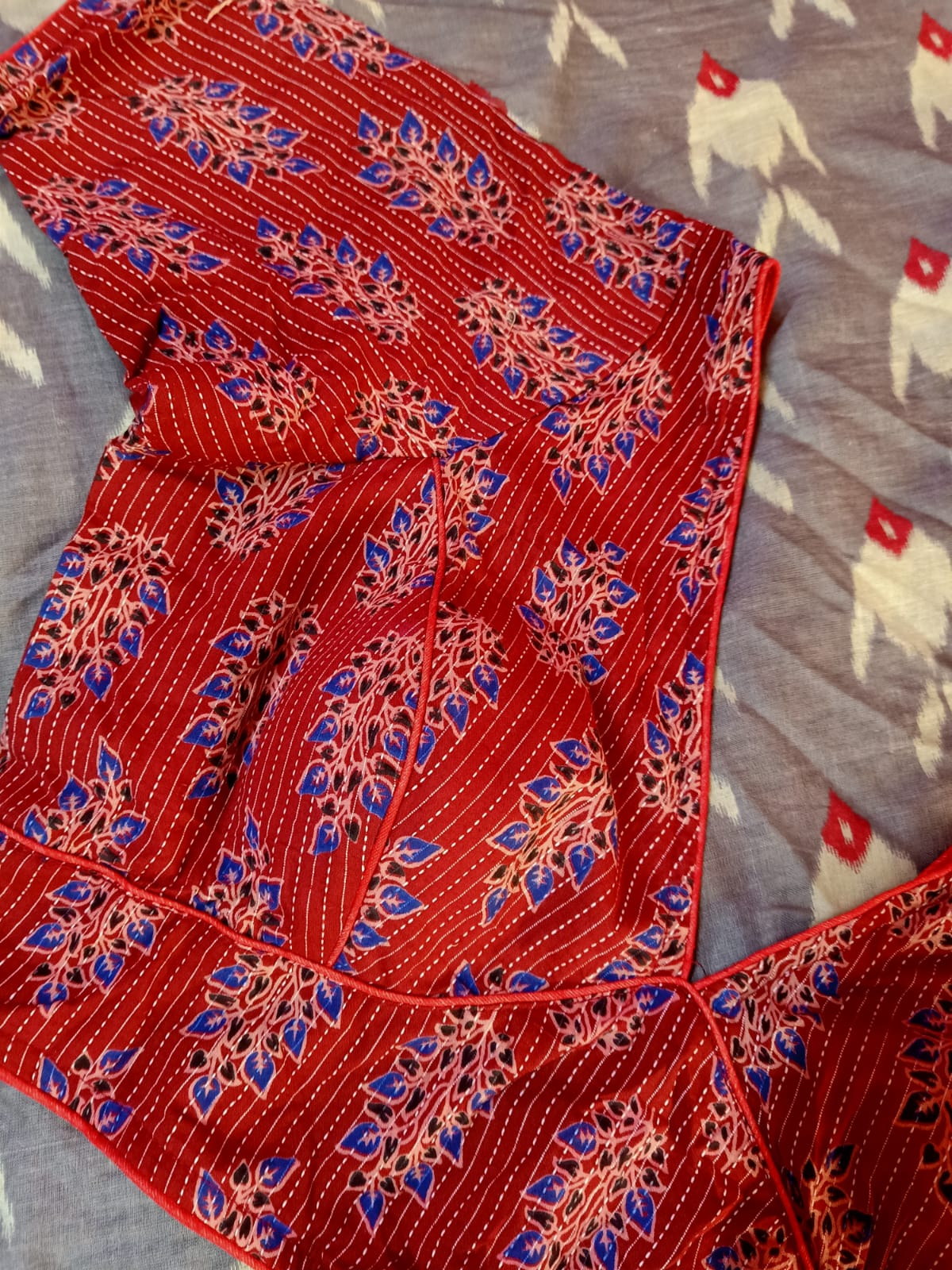 FLORAL AJRAKH PRINTED BLOUSE WITH KANTHASTITCH LINES